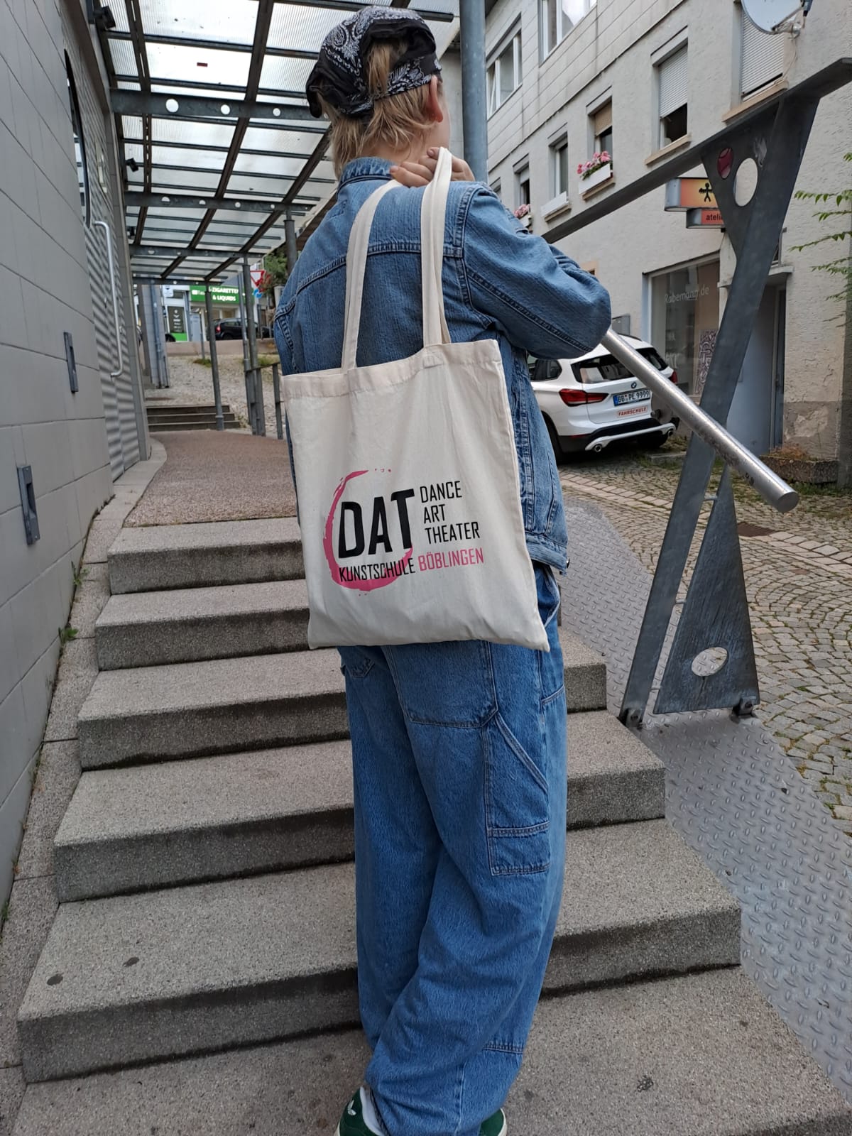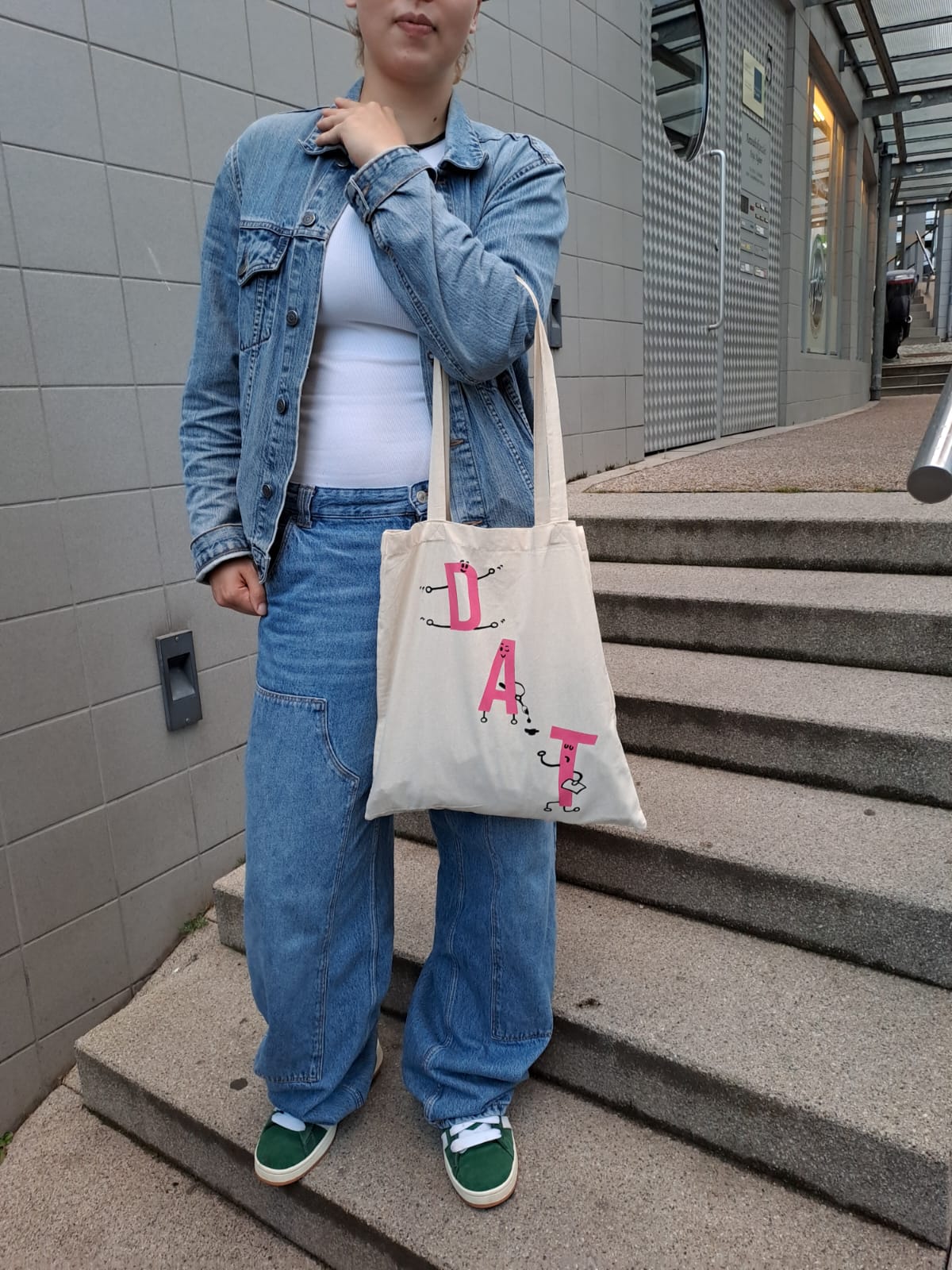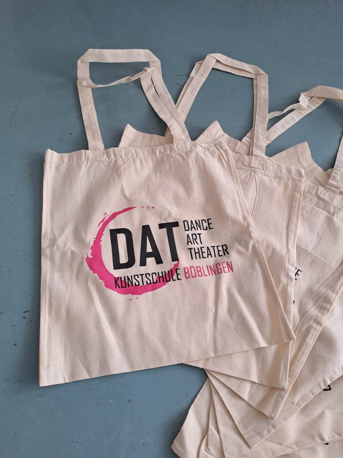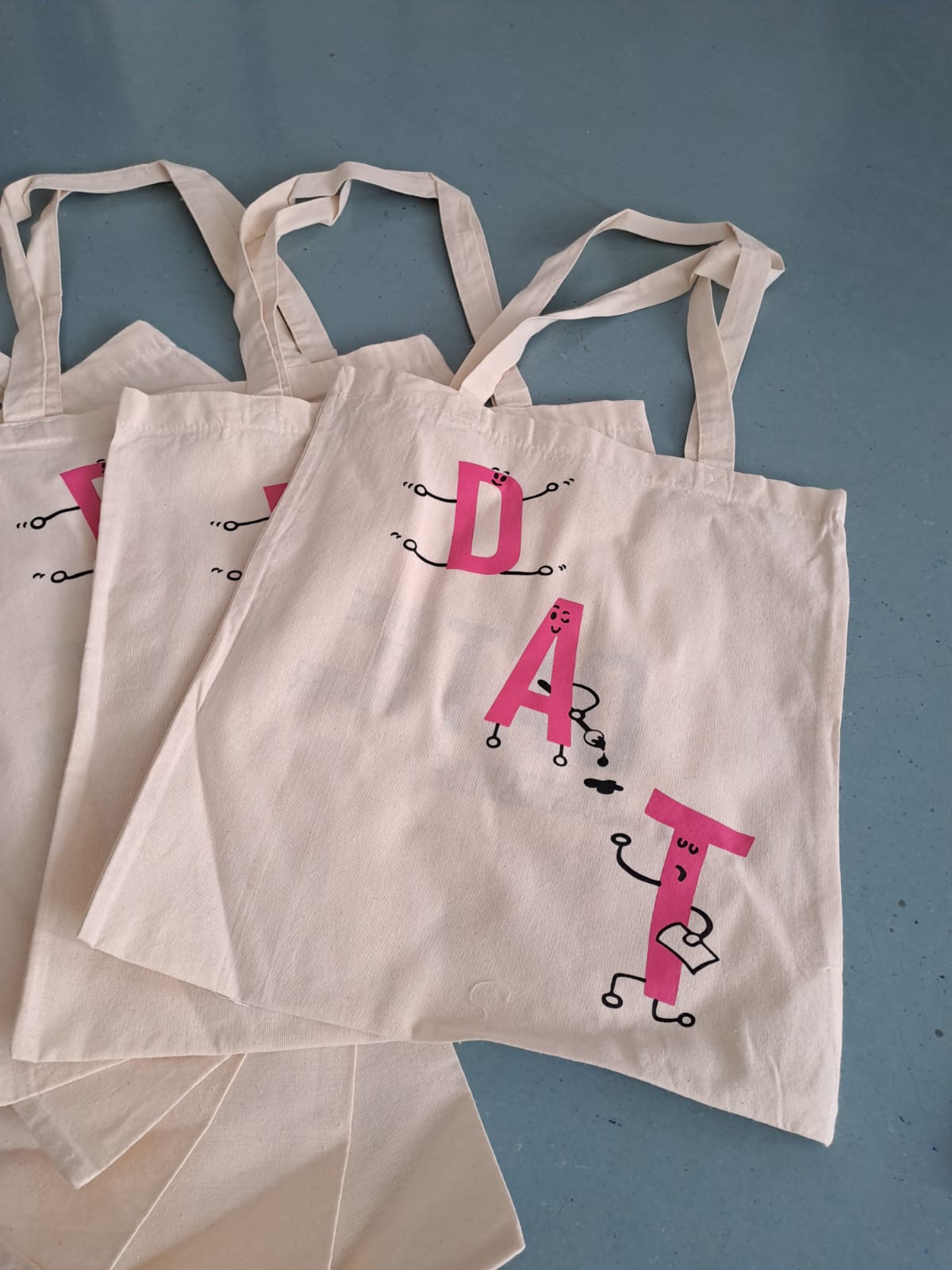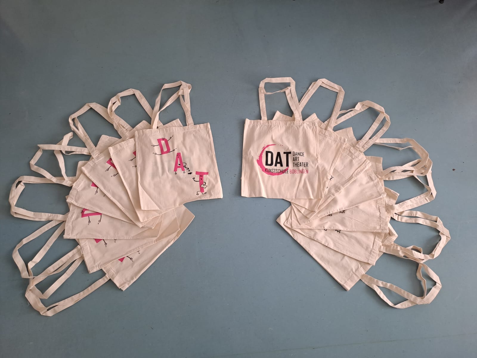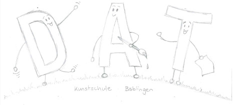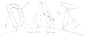 Die Maskottchen des DAT - die drei Buchstaben D, A und T sollten stärker in den Vordergrund unserer Öffentlichkeitsarbeit stehen. Daher entwarf, erstellte und organisierte Carla Thieme als ihr eigenverantwortliches Projekt Stofftaschen mit dem DAT-Logo darauf. Sie gestaltetet die beiden Seiten der Tasche, sammelte für das Projekt relevante Informationen (z.B. Kosten und empfohlene Menge) und schlug das Projekt dem Förderverein der DAT Kunstschule vor, welcher daraufhin die Produktionskosten auslegte. Die Stofftaschen können während Theateraufführungen, Festen und Events der DAT Kunstschule erworben werden.