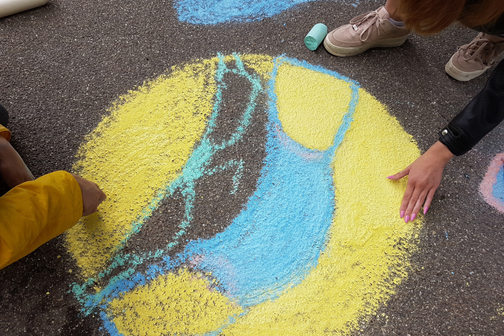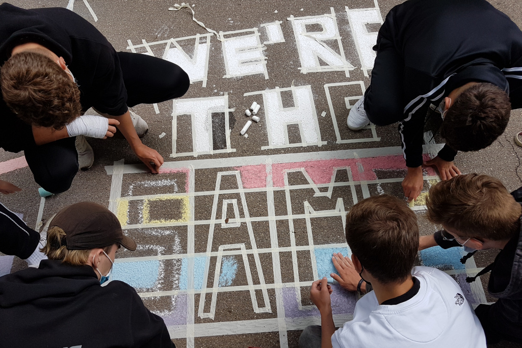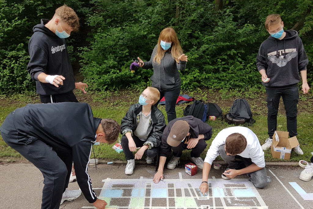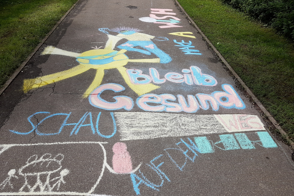 Jugend im Sommer 2021 - was bewegt junge Menschen diesen Sommer? 19 Schüler*innen einer 10. Klasse des Max-Planck-Gymnasiums haben sich Gedanken darüber gemacht, was ihre Botschaften diesen Sommer sind. Im Juli setzen sie sich dazu künstlerisch mit dem Material Kreide auseinander. So entstand tiefsinnig bunte Straßenkunst rund um das Thema "Jugend während Corona".