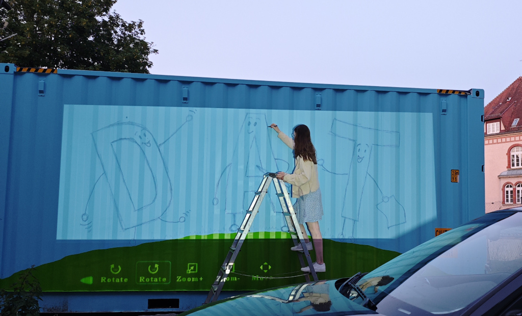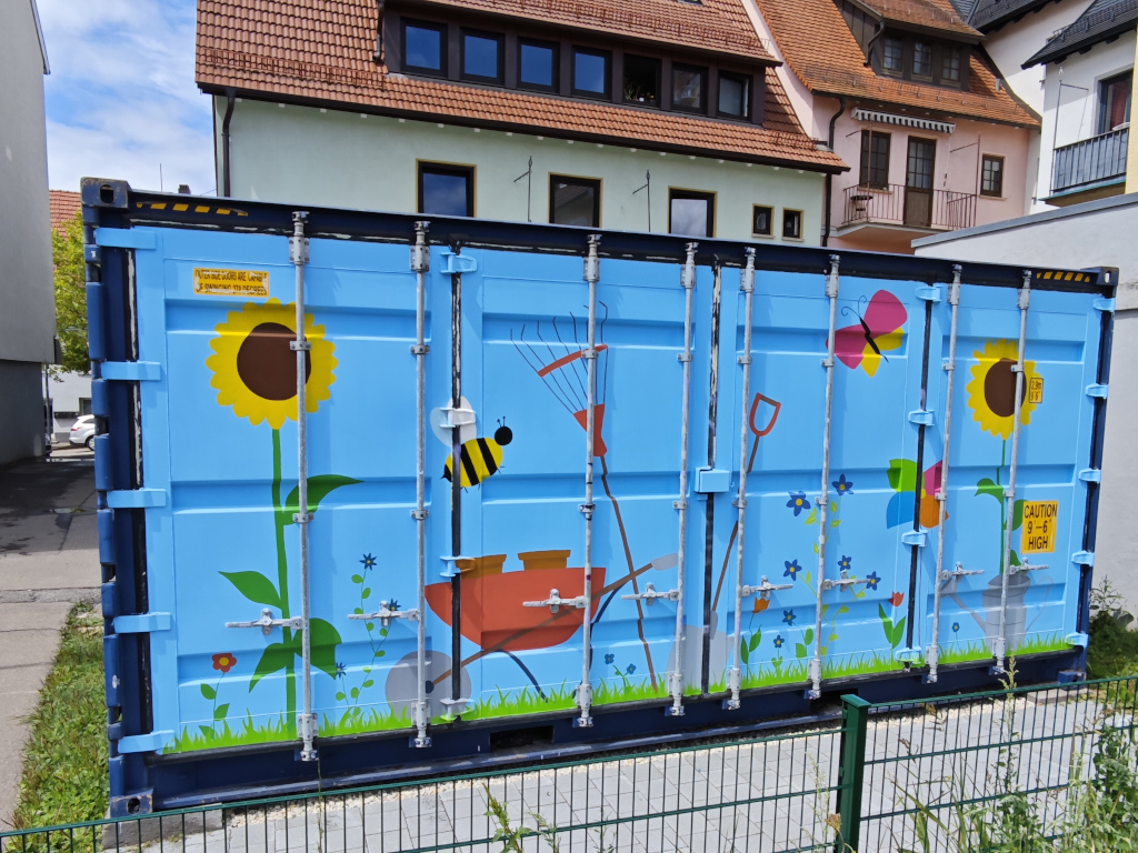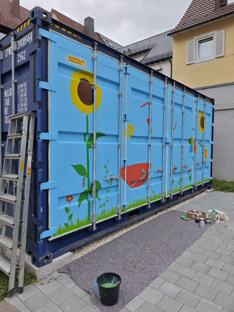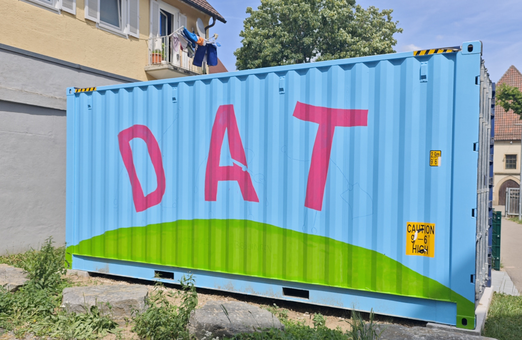 Da das DAT im Feierraum nahezu keinen Lagerraum hat, nutzen wir einen Container, der lange auf dem Schulhof der Paul-Lechler-Schule stand, wo er keine besonders gute Figur machte. Anfang 2024 wurde unser DAT-Container an seinen endgültigen Standort versetzt. Passend dazu entschied sich unsere Freiwillige Fanny Fromlowitz , ihn von außen ansprechender zu gestalten. Hierfür stand zunächst die Frage der Motivwahl im Vordergrund. Entstanden ist eine Variation der animierten DAT-Buchstaben auf der einen Seite und ein Motiv, das zum Schulgarten auf der anderen Seite passt. Fanny zeichnete die Entwürfe, übertrug sie auf den Container, besorgte Farben und anderes nötiges Material und bemalte schließlich über einen längeren Zeitraum den Container.